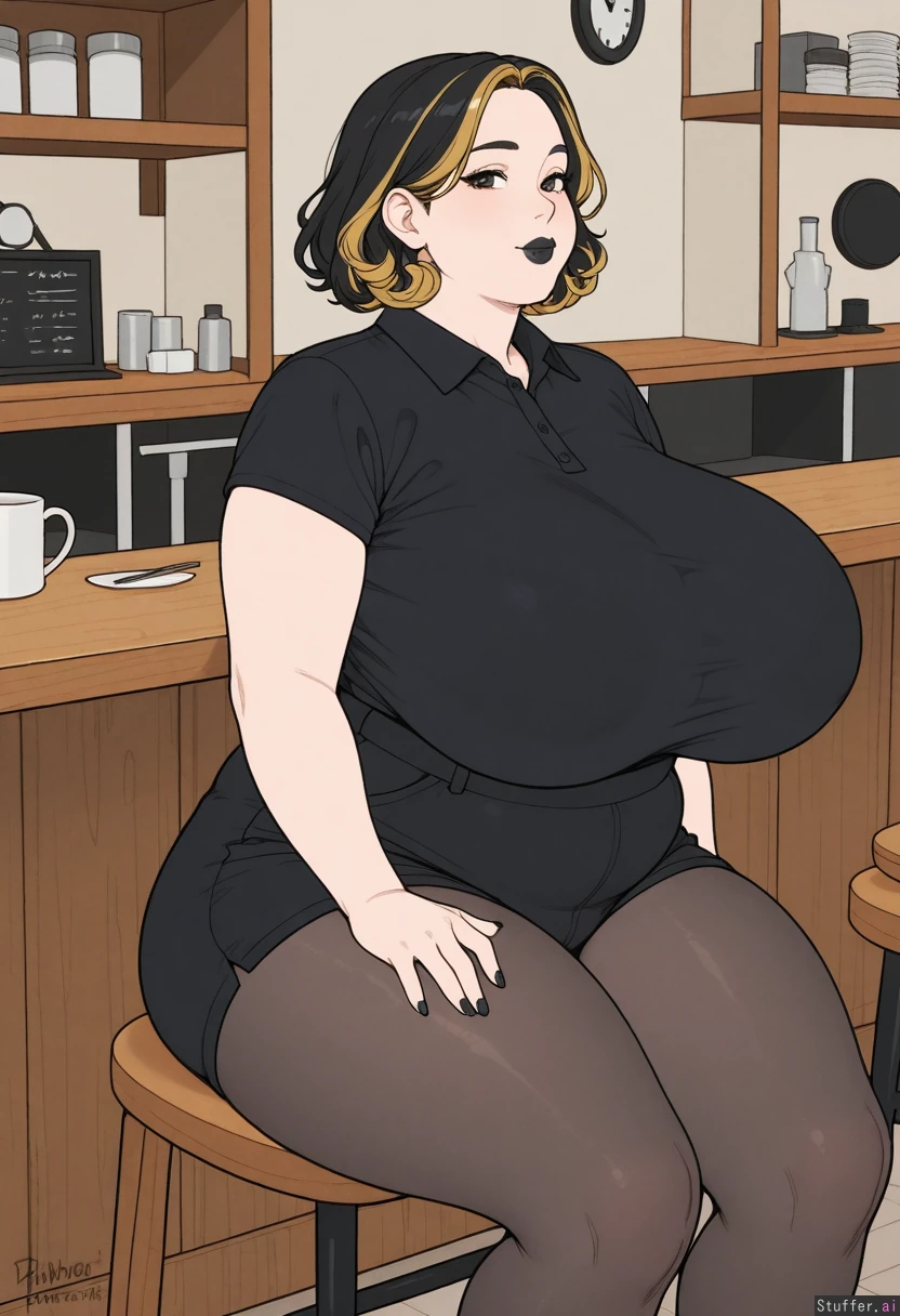 (high_rating, high_detail, flat_color, simple background), (cafe, indoors, sitting), solo, female, (milf, bimbo, out of shape, voluptuous, plump), ((frontheavy:1.4)), ((bimbofication:1.2)), ((slimthick:1.2)), ((hyper_breasts:1.2)), (curly black hair, blonde highlights), black lipstick, (chubby_face, double_chin), (black polo_shirt, black high-waist_jean_shorts, pantyhose, shirt_tucked_in, tight_clothes, skindentation), (soft_arms, soft_thighs),