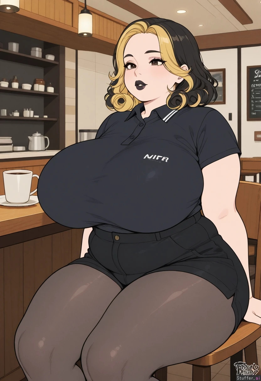 (high_rating, high_detail, flat_color, simple background), (cafe, indoors, sitting), solo, female, (milf, bimbo, out of shape, voluptuous, plump), ((frontheavy:1.4)), ((bimbofication:1.2)), ((slimthick:1.2)), ((hyper_breasts:1.2)), (curly black hair, blonde highlights), black lipstick, (chubby_face, double_chin), (black polo_shirt, black high-waist_jean_shorts, pantyhose, shirt_tucked_in, tight_clothes, skindentation), (soft_arms, soft_thighs),