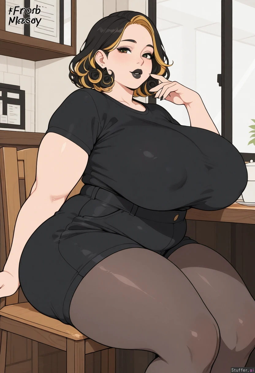 (high_rating, high_detail, flat_color, simple background), (cafe, indoors, sitting), solo, female, (milf, bimbo, out of shape, voluptuous, plump), ((frontheavy:1.4)), ((bimbofication:1.2)), ((slimthick:1.2)), ((hyper_massive_breasts:1.2)), (curly black hair, blonde highlights), black lipstick, (chubby_face, double_chin), (black polo_shirt, black high-waist_jean_shorts, pantyhose, shirt_tucked_in, tight_clothes, skindentation), (soft_arms, soft_thighs),