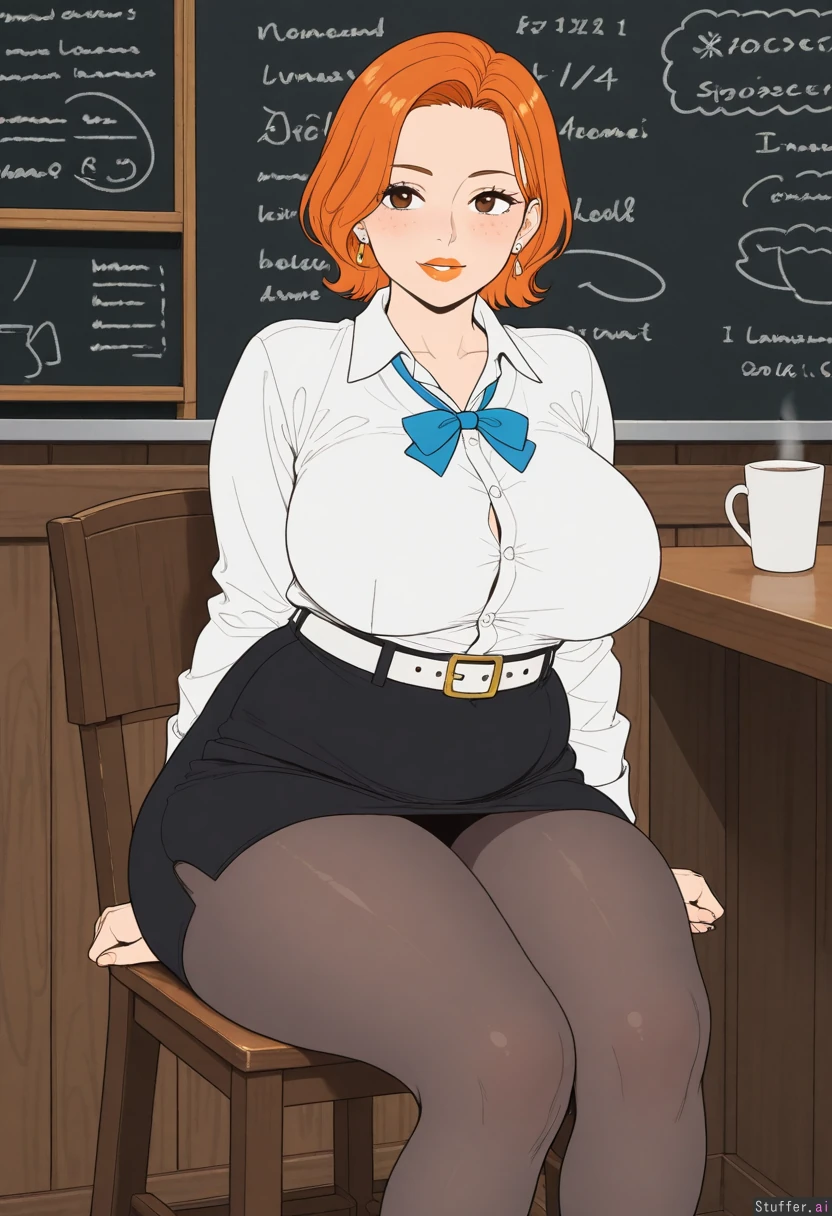 (high_rating, high_detail, flat_color, simple background), (simple_background, cafe, indoors, sitting), solo, female, ((nami_(one_piece):1.2), (milf, bimbo, out of shape, voluptuous, plump), ((frontheavy:1.4)), ((bimbofication:1.2)), ((skinny:1.2)), ((massive_breasts:1.4)), (short orange hair), brown eyes, freckles, orange lipstick, (chubby_face, double_chin), (white dress_shirt, black high-waist_skirt, white_belt, pantyhose, shirt_tucked_in, tight_clothes, skindentation), (soft_arms, soft_thighs, wide_ass),
