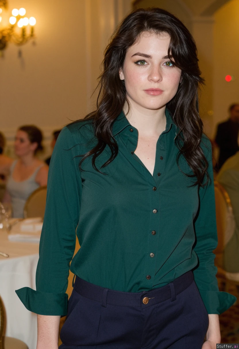 White American wkman with long dark messy hair, eyeliner, wearing dark green loose formal button up shirt from ralph lauren and office pants at a ballroom (((Chubby:0.7)))