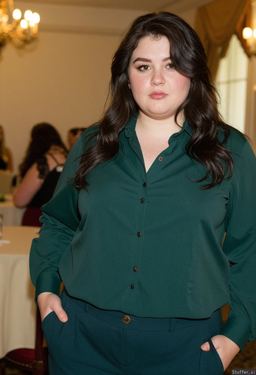 White American woman with long dark messy hair, eyeliner, wearing dark green loose formal button up shirt from ralph lauren and office pants at a ballroom (((Chubby:1.2)))