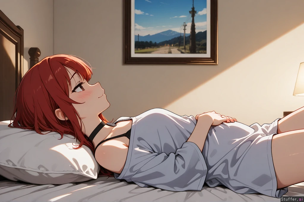 (((solo))). ((simple style:1.4)), (high detail), flat colors, color, (perfect proportions). (((detailed background))). 1woman,a thick-thighed, soft-bodied girlfriend lounging on a rumpled bed, her unbuttoned mens dress shirt hanging loosely off one shoulder to reveal the curve of her stomach and the lace trim of her panties clinging to her hips. The shirtclearly stolen from a partners closetis oversized, the cuffs rolled haphazardly to her elbows, and the fabric gapes open just enough to hint at the swell of her breasts without fully exposing them. The vibe is androgynous chicshort, mussed hair, no makeup, a single choker with a dog tag resting against her collarbonebut theres no mistaking the feminine mischief in her smirk as she glances at the viewer, like she knows exactly how good she looks in this stolen shirt, in this stolen moment. The lighting is golden and dim, maybe from a bedside lamp, casting warm shadows along the dip of her waist and the softness of her thighs. Its intimate, its effortless, and its *hot*. (blush), ((looking down)). ((Gamer girl)), ((bedroom, laying In bed)). ((side_profile:2.0)), (((She's lying on her back:1.3))). (lazy), bag of chips, gray shirt, (oversized_shirt:1.3), ((side view))