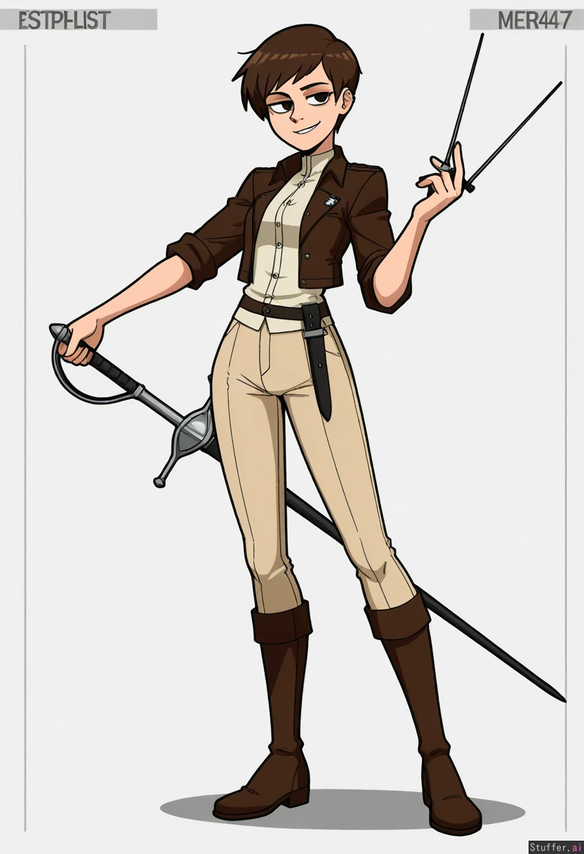 Vanripper, mrk gavatino, stopu42 Character concept, simple white background, full body shot, dim colours, solo Fantasy, duelist, beige clothes, rapier, lace_trim, pants, boots, top, jacket, dagger, Mature woman, old, brown hair, pixie_cut, skinny, petite, slim, small flat boobs, tall, fencing pose, nose_piercing, smug, smirk,