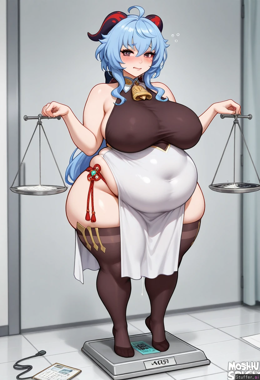 (ganyu_(genshin_impact)), ((eyeliner)), choker, (kittew(artist)), blushyspicy(artist), drunk, cum_drip, (((weighing_scale, standing on electronic scale in a doctors office))) (((cumflation), (belly_bursting_out_of_clothes), (belly_overhang), (large_breasts), (gigantic_belly), (thick_thighs), (morbidly_obese), (love_handles), (embarrassed)): 1.00),
