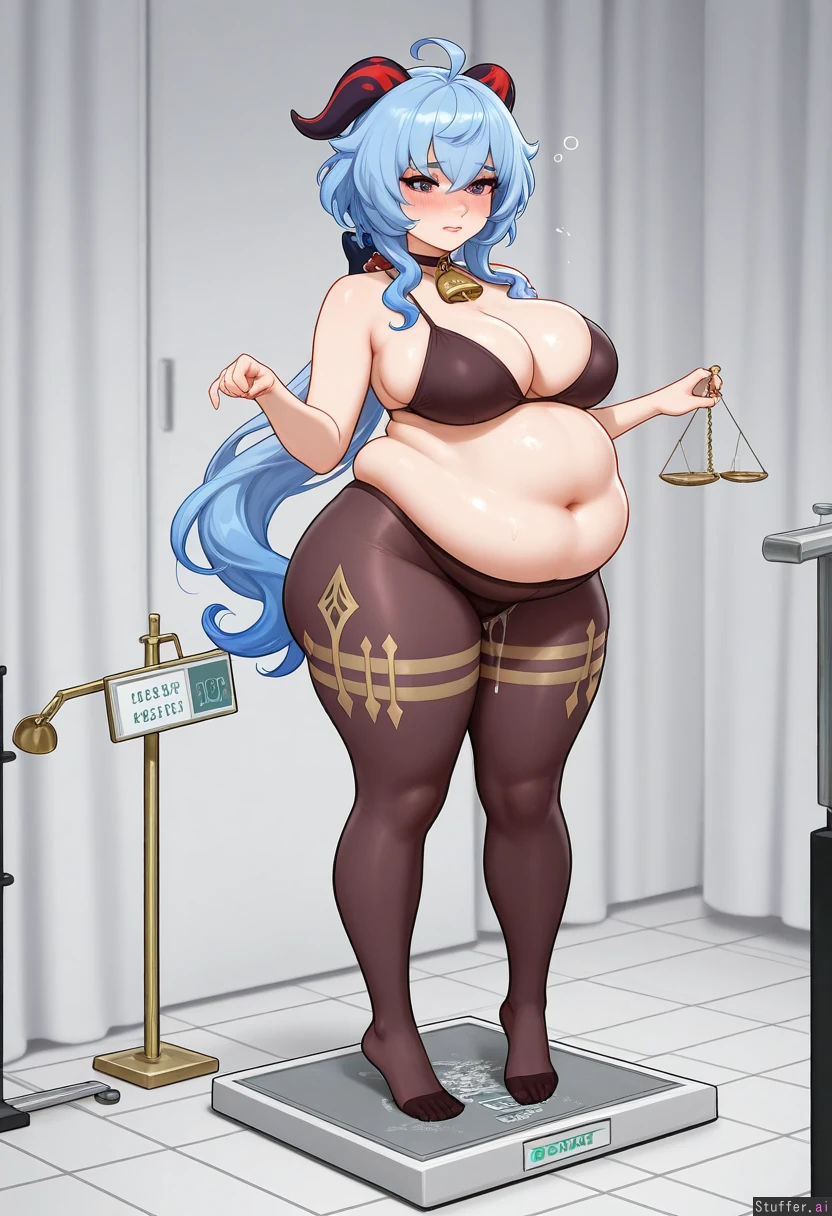(ganyu_(genshin_impact)), ((eyeliner)), choker, (kittew(artist)), blushyspicy(artist), drunk, cum_drip, (((weighing_scale, standing on electronic scale in a doctors office))) (((cumflation), (belly_bursting_out_of_clothes), (belly_overhang), (large_breasts), (gigantic_belly), (thick_thighs), (morbidly_obese), (love_handles), (embarrassed)): 0.95),