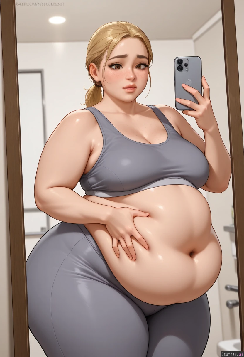 **base** (best quality), (high rating), absurd res, high res, detailed, ultra quality, ((high quality)), masterpiece, (ultra high resolution), stunning beauty, detailed face, intricate detail, sophisticated detail, exquisite detail, perfect 2D art, realistic lighting, realistic shading, correct anatomy, 8k, (highly detailed face), highly detailed skin texture, 1girl, ((hyperrealistic, photorealistic)), (((detailed face))), ((solo)), **artists** Kittew(artist), aromasensei(artist), miyu(artist), albatrossart(artist), balecxi(artist), modeus14(artist), **appearance** brunette, (((Japanese woman, freckles, asian_female, Asian features, adult face))), (((intricately detailed sexy expressive eyes, brown eyes, Asian eyes))), (((long blonde hair, ponytail))), sexy face, thin face, (((freckles, thick brown eyebrows))), (((expressive_face))), **clothes** ((Grey sports top, high-waisted grey yoga pants)), **setting** Luxury modern bathroom, low light, diffuse light, dim light, (detailed background, realistic background), **pose** (((expressive eyes, raised eyebrows, curious expression))), (((taking a mirror selfie, hand on belly))), **body** ((Gigantic_thighs, gigantic_ass, huge_belly, obese:1.5)))