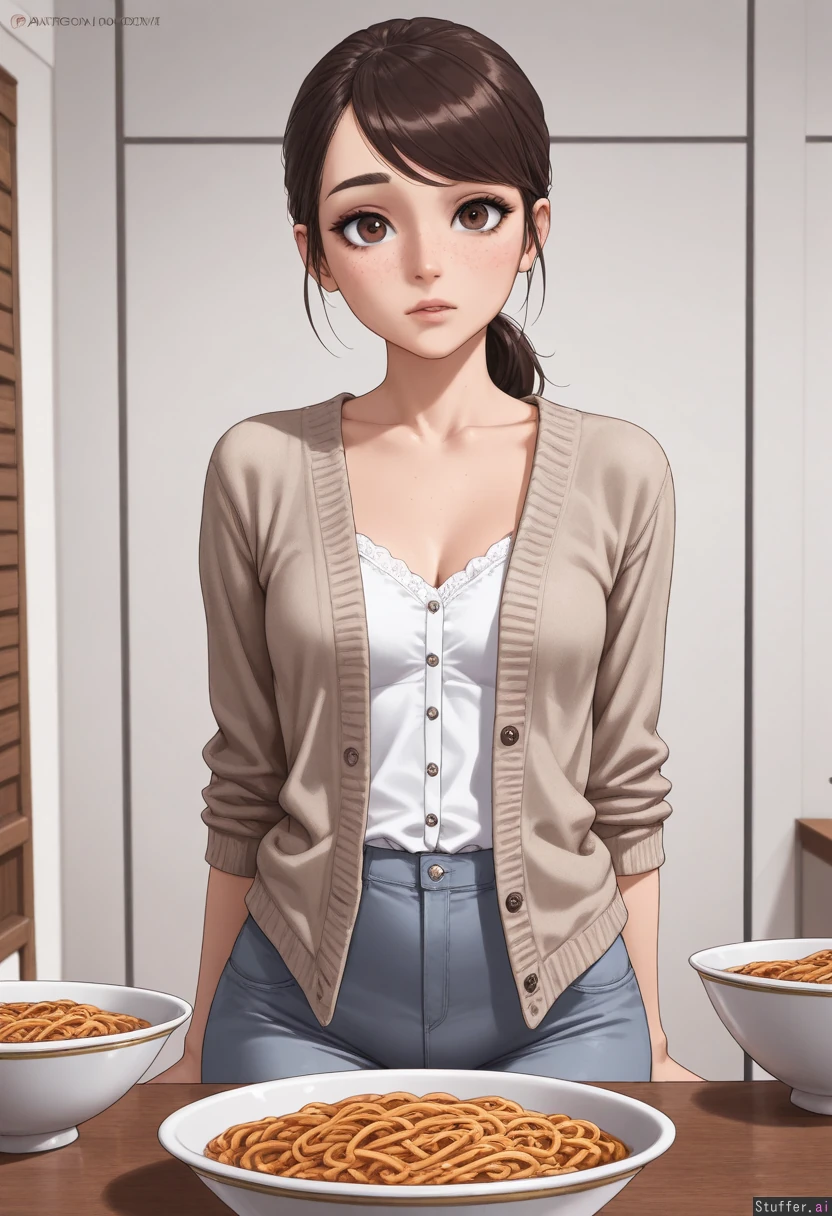 **base** (best quality), (high rating), absurd res, high res, detailed, ultra quality, ((high quality)), masterpiece, (ultra high resolution), stunning beauty, detailed face, intricate detail, sophisticated detail, exquisite detail, perfect 2D art, realistic lighting, realistic shading, correct anatomy, 8k, (highly detailed face), highly detailed skin texture, 1girl, ((hyperrealistic, photorealistic)), (((detailed face))), ((solo)), **artists** Kittew(artist), aromasensei(artist), miyu(artist), albatrossart(artist), balecxi(artist), modeus14(artist), **appearance** brunette, (((Mexican woman, freckles, adult face))), (((intricately detailed sexy expressive eyes, brown eyes))), (((long brown hair, ponytail, side-swept bangs))), sexy face, thin face, (((freckles, thick brown eyebrows))), (((expressive_face))), **clothes** ((blue button up cardigan, grey pants)), **setting** Luxury modern apartment, low light, diffuse light, dim light, (detailed background, realistic background), ((many large bowls of creamy pasta on a table)), **pose** (((expressive eyes, raised eyebrows, curious expression))), **body** (((Skinny, narrow_hips)))