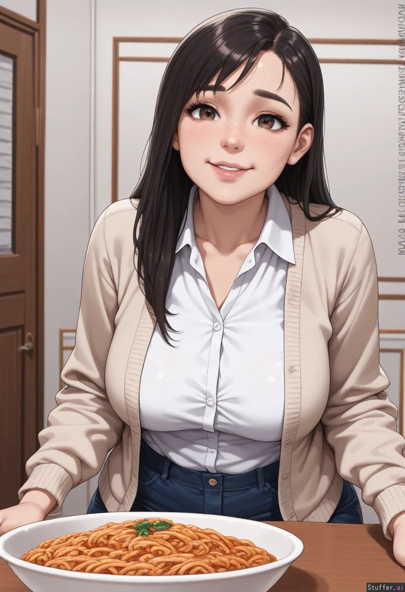 **base** (best quality), (high rating), absurd res, high res, detailed, ultra quality, ((high quality)), masterpiece, (ultra high resolution), stunning beauty, detailed face, intricate detail, sophisticated detail, exquisite detail, perfect 2D art, realistic lighting, realistic shading, correct anatomy, 8k, (highly detailed face), highly detailed skin texture, 1girl, ((hyperrealistic, photorealistic)), (((detailed face))), ((solo)), **artists** Kittew(artist), aromasensei(artist), miyu(artist), albatrossart(artist), balecxi(artist), modeus14(artist), **appearance** brunette, (((Latina woman, freckles, adult face))), (((intricately detailed sexy expressive eyes, brown eyes))), (((long black hair, side-swept bangs))), sexy face, thin face, (((freckles, thick brown eyebrows))), **clothes** ((button up cardigan, white button up shirt, jean pants)), **setting** Luxury modern apartment, low light, diffuse light, dim light, (detailed background, realistic background), ((many huge bowls of creamy pasta on a table)), **pose** (((raised eyebrows, happy, curious expression))), **body** (((Obese, gigantic_belly, gigantic_ass, gigantic_thighs, gigantic_hips:1.0)))