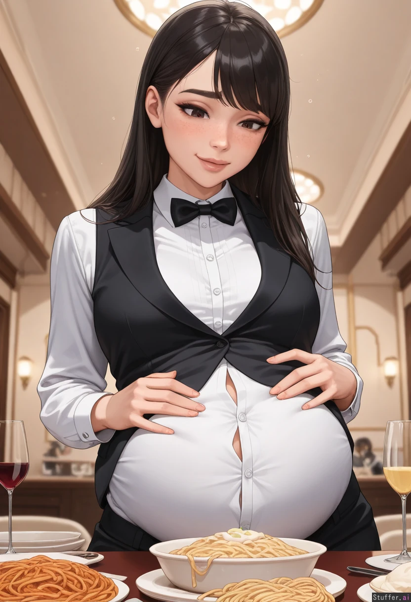 **base** (best quality), (high rating), absurd res, high res, detailed, ultra quality, ((high quality)), masterpiece, (ultra high resolution), stunning beauty, detailed face, intricate detail, sophisticated detail, exquisite detail, perfect 2D art, realistic lighting, realistic shading, correct anatomy, 8k, (highly detailed face), highly detailed skin texture, 1girl, ((hyperrealistic, photorealistic)), (((detailed face))), ((solo)), **artists** Kittew(artist), aromasensei(artist), miyu(artist), albatrossart(artist), balecxi(artist), modeus14(artist), **appearance** brunette, (((Columbian woman, freckles, asian_female, Asian features, adult face))), (((intricately detailed sexy expressive eyes, brown eyes, Asian eyes))), (((long straight black hair, side-swept bangs))), sexy face, thin face, (((freckles, thick eyebrows))), (((expressive_face))), **clothes** ((White tuxedo button up shirt, small black bow tie, buttoned black business vest, black suit pants, tuxedo)), ((shirt_tucked_in)), **setting** Beautiful luxury penthouse, low light, diffuse light, dim light, (detailed background, realistic background), (((many big cream pasta bowls on table, too much food, buffet, wine on table))) , **pose** (((expressive eyes, looking down, raised eyebrows))), (((drunken expression, blushing, drunk, hand on belly))) **body** ((Massive belly, big thighs, big ass, huge belly, fat:1.0)))