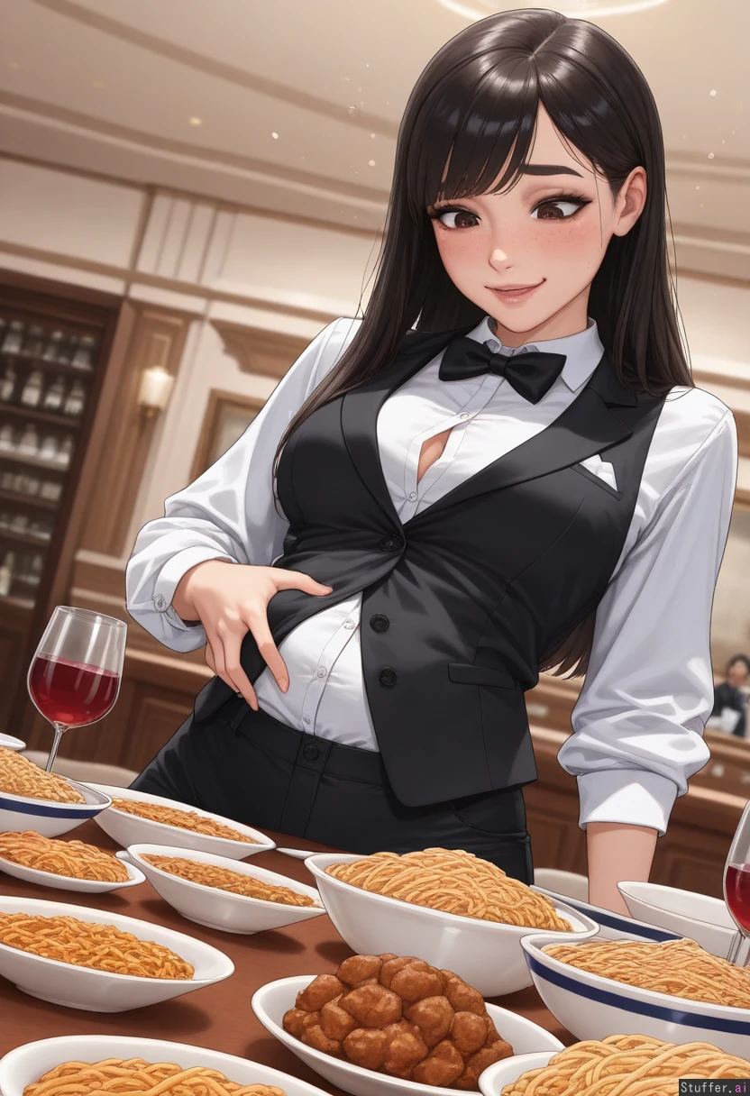 **base** (best quality), (high rating), absurd res, high res, detailed, ultra quality, ((high quality)), masterpiece, (ultra high resolution), stunning beauty, detailed face, intricate detail, sophisticated detail, exquisite detail, perfect 2D art, realistic lighting, realistic shading, correct anatomy, 8k, (highly detailed face), highly detailed skin texture, 1girl, ((hyperrealistic, photorealistic)), (((detailed face))), ((solo)), **artists** Kittew(artist), aromasensei(artist), miyu(artist), albatrossart(artist), balecxi(artist), modeus14(artist), **appearance** brunette, (((Columbian woman, freckles, asian_female, Asian features, adult face))), (((intricately detailed sexy expressive eyes, brown eyes, Asian eyes))), (((long straight black hair, side-swept bangs))), sexy face, thin face, (((freckles, thick eyebrows))), (((expressive_face))), **clothes** ((White tuxedo button up shirt, small black bow tie, buttoned black business vest, black suit pants, tuxedo)), ((shirt_tucked_in, button_gap)), **setting** Beautiful luxury penthouse, low light, diffuse light, dim light, (detailed background, realistic background), (((many big cream pasta bowls on table, too much food, buffet, wine on table))) , **pose** (((expressive eyes, looking down, raised eyebrows))), (((drunken expression, blushing, drunk, hand on belly))) **body** ((Massive belly, big thighs, big ass, huge belly, fat:0.7)))
