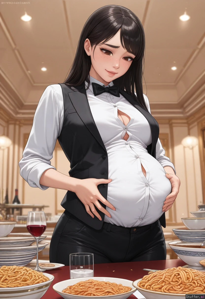 **base** (best quality), (high rating), absurd res, high res, detailed, ultra quality, ((high quality)), masterpiece, (ultra high resolution), stunning beauty, detailed face, intricate detail, sophisticated detail, exquisite detail, perfect 2D art, realistic lighting, realistic shading, correct anatomy, 8k, (highly detailed face), highly detailed skin texture, 1girl, ((hyperrealistic, photorealistic)), (((detailed face))), ((solo)), **artists** Kittew(artist), aromasensei(artist), miyu(artist), albatrossart(artist), balecxi(artist), modeus14(artist), **appearance** brunette, (((Columbian woman, freckles, asian_female, Asian features, adult face))), (((intricately detailed sexy expressive eyes, brown eyes, Asian eyes))), (((long straight black hair, side-swept bangs))), sexy face, thin face, (((freckles, thick eyebrows))), (((expressive_face))), **clothes** ((White tuxedo button up shirt, small black bow tie, buttoned black business vest, black suit pants, tuxedo)), ((shirt_tucked_in, button_gap)), **setting** Beautiful luxury penthouse, low light, diffuse light, dim light, (detailed background, realistic background), (((many big cream pasta bowls on table, too much food, buffet, wine on table))) , **pose** (((expressive eyes, looking down, raised eyebrows))), (((drunken expression, blushing, drunk, hand on belly))) **body** ((Massive belly, big thighs, big ass, huge belly, fat:0.9)))