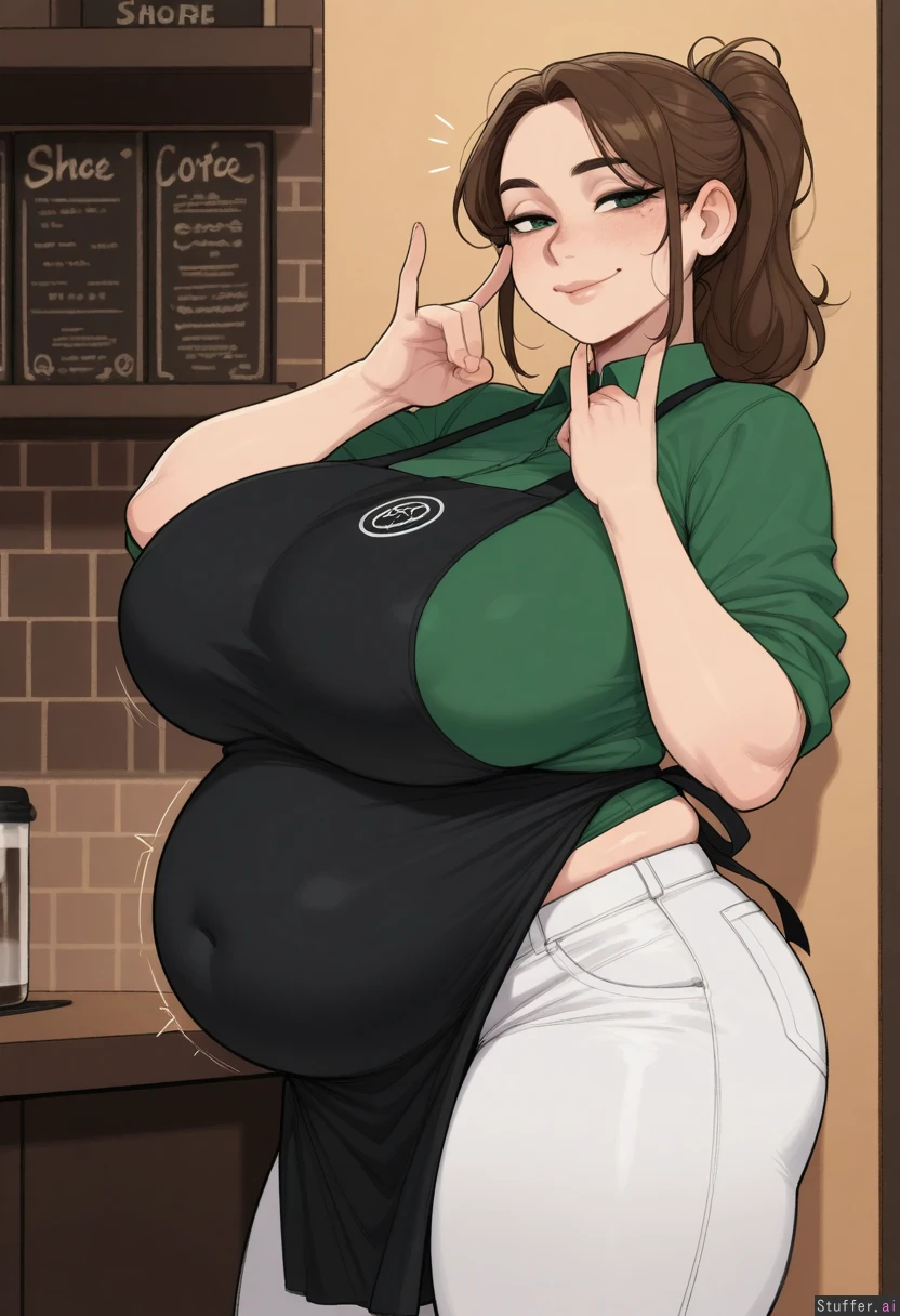 highly detailed, best quality, perfect anatomy, perfect proportions, (perfect lighting, warm lighting), perfect shading, beautiful face, beautiful eyes, Solo, One girl, Krekkov (artist), KAMII MOMORU (artist), 21+, ((alone, 1 person: 1.0)), ((Extremely chubby)), ((big breasts)) (Leaning on wall), dark green eyes, (small black apron, green polo, white jeans, she has a messy ponytail, she has brown hair), her apron covers her belly, (Coffee shop), covered belly, Half closed eyes, bloated belly, big belly, hyper belly, closed mouth, looking at viewer, sex gesture, smirking, (penetration_gesture:1.4)