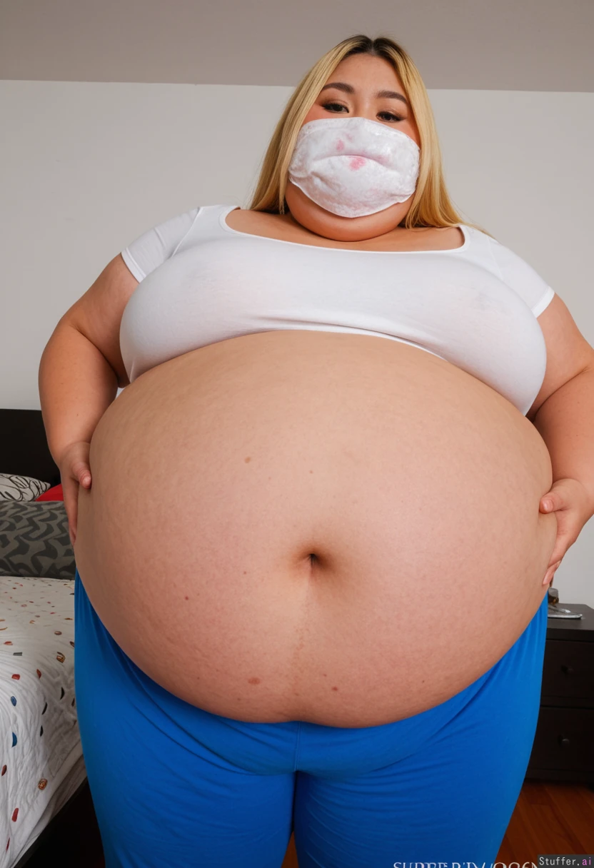 Beautiful 20 yo Korean woman, hair dyed blonde, (((wearing light white summer top and blue trackauit pants))) (navel piercing), necklace, in bedroom, ((looking down at belly:1.2)) ((holding lower belly)) (((wide hips:1.4))) ((Plump:1.45)) ((Bloated fat belly:1.6)) ((Super ultra Morbidly Obese:1.5)) ((Massive boobs:1.2)) ((Stuffed colossal overfed Globular gut:1.6)) ((Massive Belly hang:1.7)) ((Love handles spilling over pants:1.4)) ((Expresson on face that looks like eaten too much food:1.7)) Amazing lighting