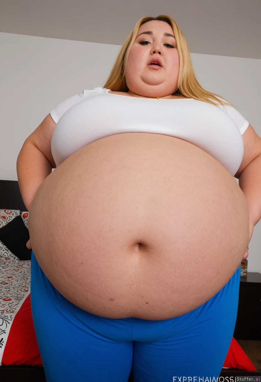Beautiful 20 yo Korean woman, hair dyed blonde, (((wearing light white summer top and blue trackauit pants))) (navel piercing), necklace, in bedroom, ((looking down at belly:1.2)) ((holding lower belly)) (((wide hips:1.4))) ((Plump:1.45)) ((Bloated fat belly:1.6)) ((Super ultra Morbidly Obese:1.7)) ((Massive boobs:1.2)) ((Stuffed colossal overfed Globular gut:1.8)) ((Massive Belly hang:1.8)) ((Love handles spilling over pants:1.4)) ((Expresson on face that looks like eaten way too much food:1.7)) Amazing lighting
