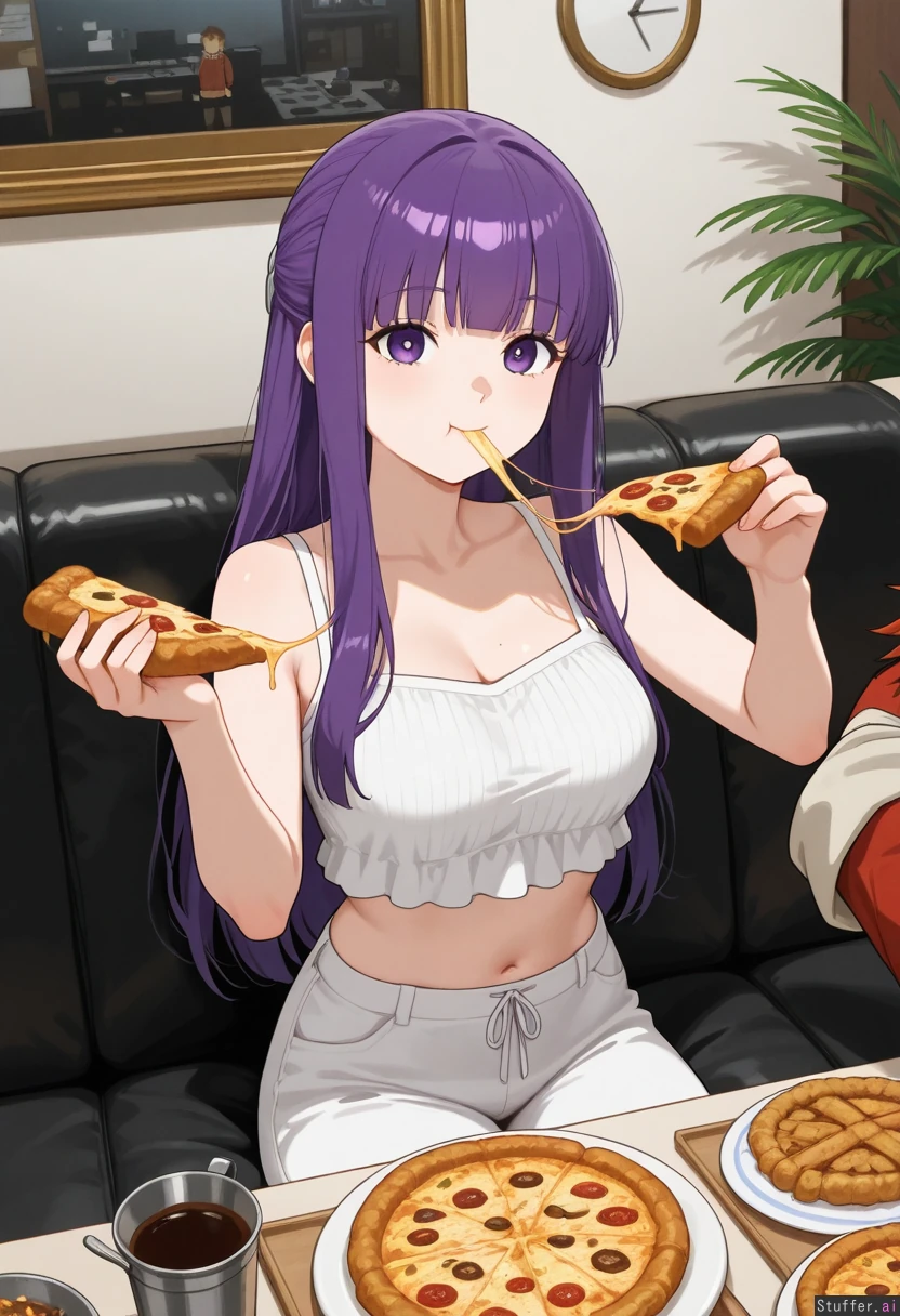 Two_characters: Fern and Stark both from Frieren anime. Stark is male. Fern is gaining weight. Fern_(Frieren_anime) is sitting in a luxurious throne surrounded by food in a kitchen of food , white casual crop top, gray home sports short, messily eating lots of unhealthy greasy food like pizza, burgers, pies on the couch as she watches TV. ((Stark_(Frieren) is serving and feeding her lots of food encouraging her to keep eating! He is getting turned on by how much Fern eats and keeps over feeding her!.)) Amazing quality, perfect shading.