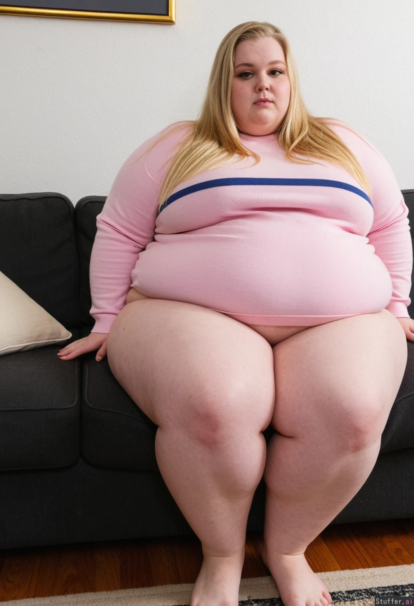 Big Wide Trousers, pale pink fabric, blond natural long hair, striped wide pullover, sitting on dark couch, (Morbidly_obese,plump_thighs: 1.2)