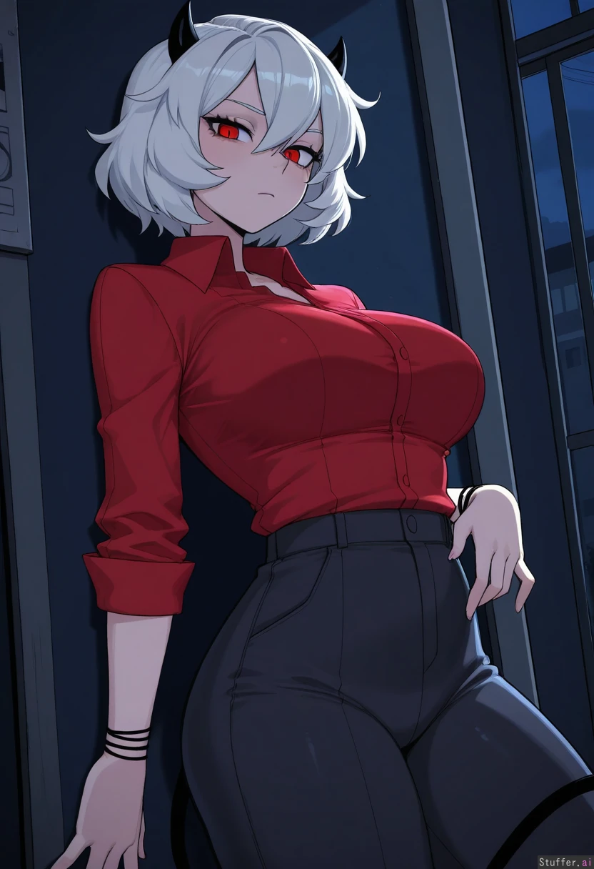 absurdres, 8k, perfect anatomy, masterpiece, beautiful face, beautiful eyes, RockSolidArt. /(artist/), RockSolidArt(artist/) ,8), (merunyaa), (usa37107692:1.2), (ohasi_art), (betterwithsalt) ((One girl)), Malina(helltaker), ((Bedroom, dark room, night)) (covered belly), ((mature)) ((Glare)) ((Standing, leaning against wall)), (looking at viewer), (side view) ((Narrow shoulders, cinched waist)) ((curvy)), red button shirt, black pants, (big boobs:1.3),