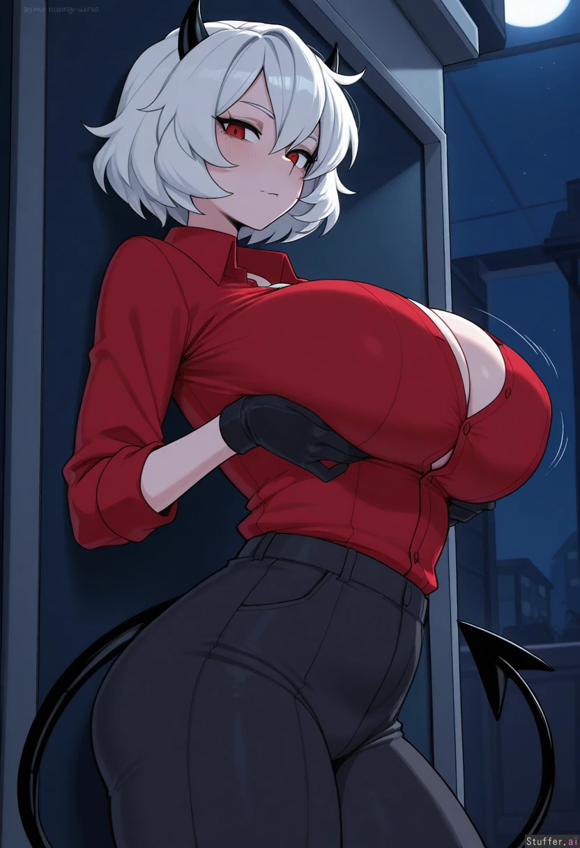 absurdres, 8k, perfect anatomy, masterpiece, beautiful face, beautiful eyes, RockSolidArt. /(artist/), RockSolidArt(artist/) ,8), (merunyaa), (usa37107692:1.2), (ohasi_art), (betterwithsalt) ((One girl)), Malina(helltaker), ((Bedroom, dark room, night)) (covered belly), ((mature)) ((Glare)) ((Standing, leaning against wall)), (looking at viewer), (side view) ((Narrow shoulders, cinched waist)) ((curvy)), red button shirt, black pants, huge boobs, button stretch, massive boobs, (hyper boobs), bigger boobs, expanding breasts, breasts overflow, bursting breasts, perky breasts,