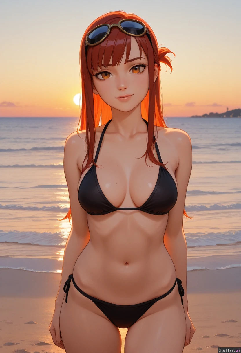 1woman, Lucy Maclane, Fallout, Fit, thin, slim, Beach, daytime, golden hour, Medium breasts, wide hips, horny expression, flirting with viewer, has a crush on the viewer, (stuffed belly, potbelly, love handles, chubby, obese, spilling belly, belly rolls, bulging belly: 0.0 )