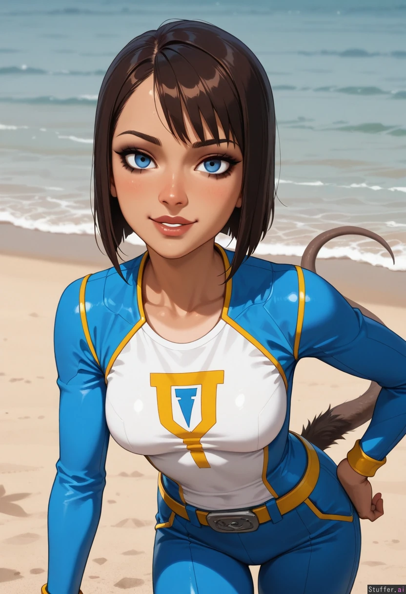 ((Fallout series, Lucy, vault suit, white t shirt, long dark brown hair, tail hair, round blue eyes, dark makeup, slightly tanned skin, narrow nose, square jawline, pronounced upper lip, 1 girl)) Fit, thin, slim, Beach, daytime, golden hour, Medium breasts, horny expression, flirting with viewer, has a crush on the viewer, (stuffed belly, potbelly, love handles, chubby, obese, spilling belly, belly rolls, bulging belly: 0.0 )