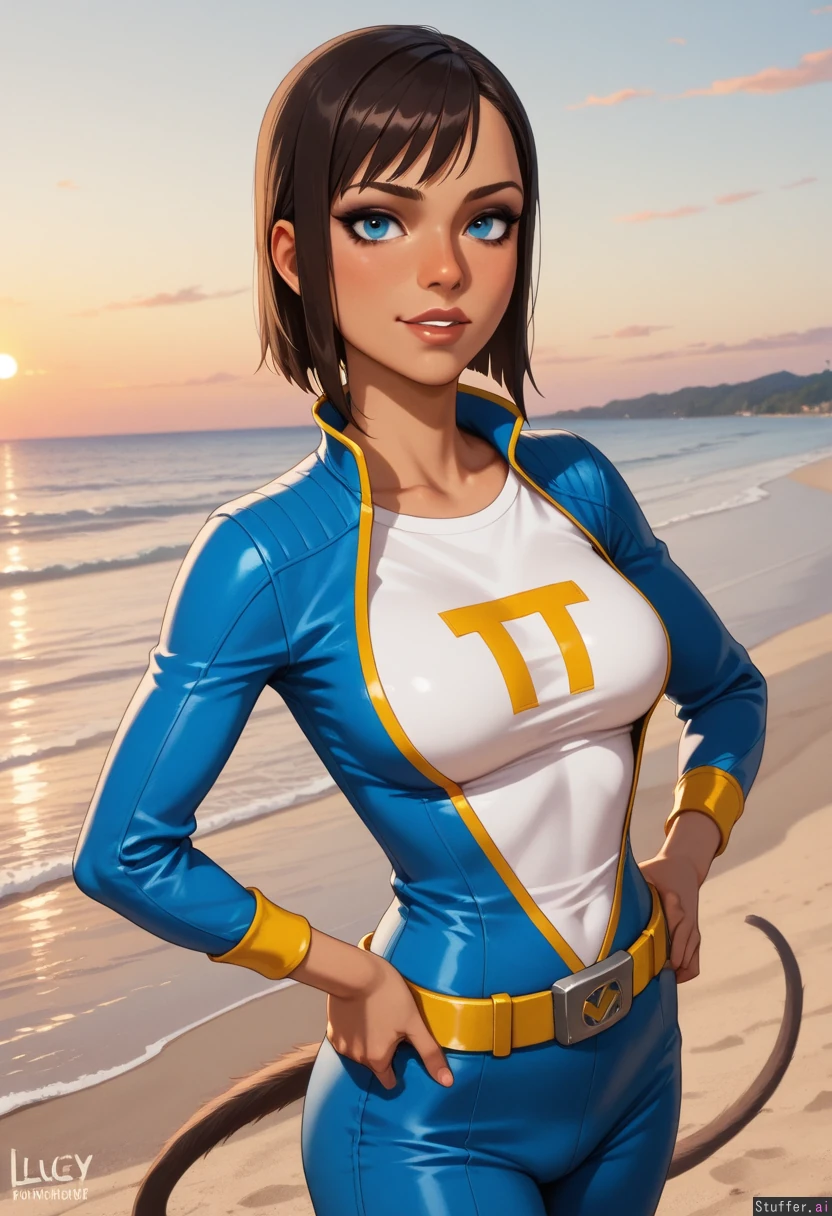 ((Fallout series, Lucy, vault suit, white t shirt underneath, long dark brown hair, tail hair, round blue eyes, dark makeup, slightly tanned skin, narrow nose, square jawline, pronounced upper lip, 1 girl)) Fit, thin, slim, Beach, daytime, golden hour, Medium breasts, horny expression, flirting with viewer, has a crush on the viewer, (stuffed belly, potbelly, love handles, chubby, obese, spilling belly, belly rolls, bulging belly: 0.0 )