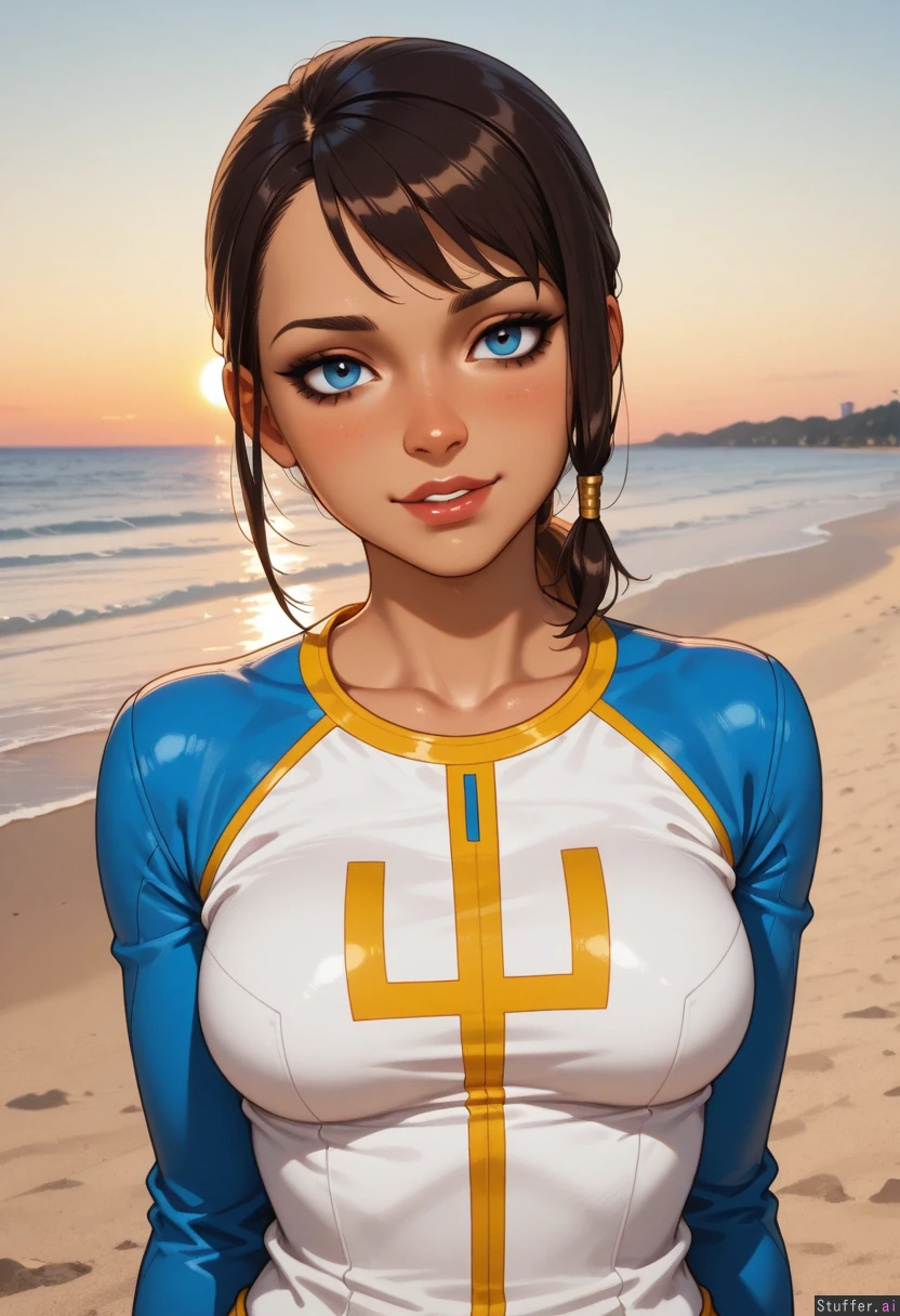 ((Fallout series, Lucy, vault suit, white t shirt underneath, long dark brown hair, hair tied, round blue eyes, dark makeup, slightly tanned skin, narrow nose, square jawline, pronounced upper lip, 1 girl)) Fit, thin, slim, Beach, daytime, golden hour, Medium breasts, horny expression, flirting with viewer, has a crush on the viewer, (stuffed belly, potbelly, love handles, chubby, obese, spilling belly, belly rolls, bulging belly: 0.0 )