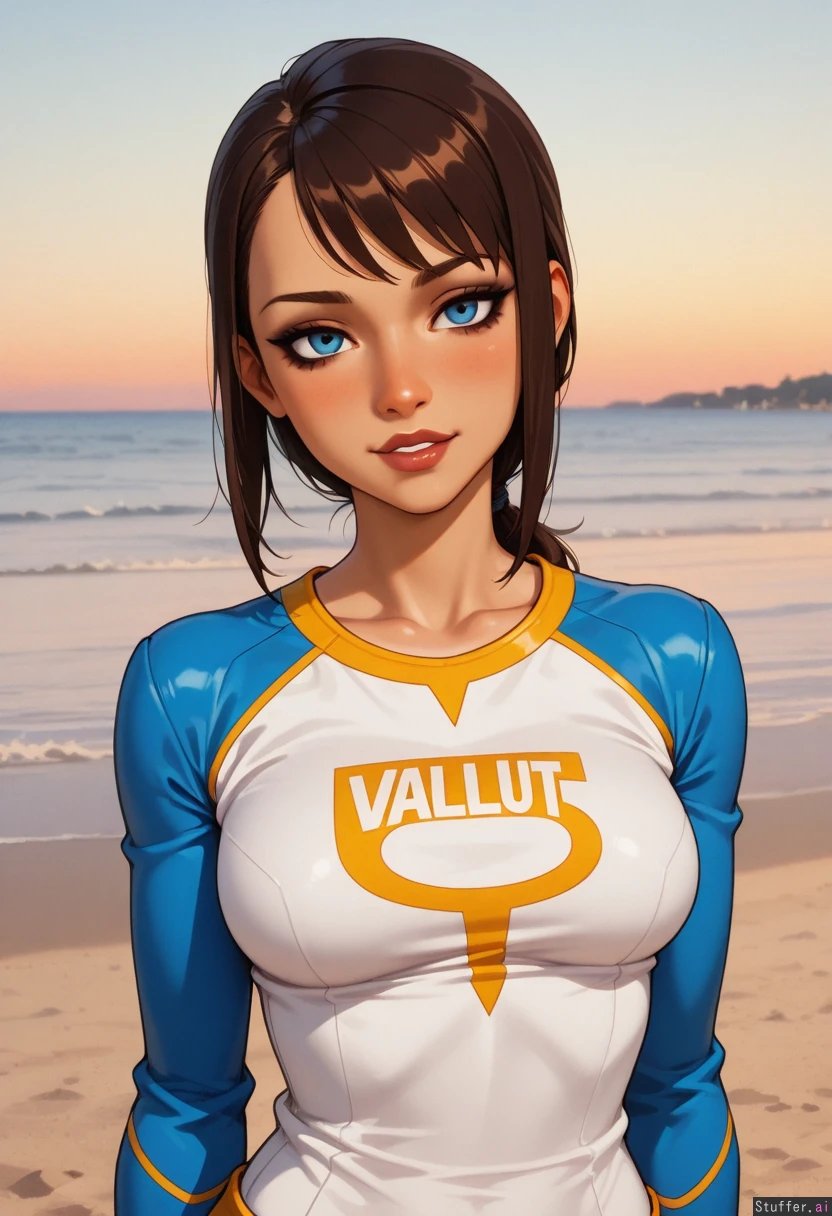 ((Fallout series, Lucy, vault suit, white t shirt underneath, long dark brown hair, hair tied, round blue eyes, dark makeup, slightly tanned skin, narrow straight nose, square jawline, pronounced upper lip, 1 girl)) Fit, thin, slim, narrow waist, thin body, Beach, daytime, golden hour, Medium breasts, horny expression, flirting with viewer, has a crush on the viewer, (stuffed belly, potbelly, love handles, chubby, obese, spilling belly, belly rolls, bulging belly: 0.0 )