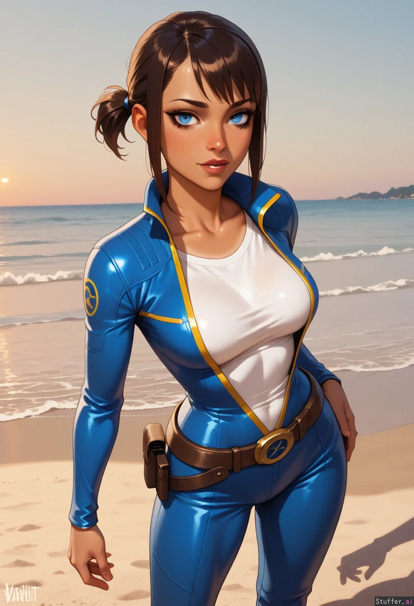 ((Fallout series, Lucy, dark blue vault suit, white t shirt underneath, long dark brown hair, hair tied, round blue eyes, dark makeup, slightly tanned skin, narrow straight nose, square jawline, pronounced upper lip, 1 girl)) Fit, thin, slim, narrow waist, thin body, long legs, Beach, daytime, golden hour, Medium breasts, horny expression, flirting with viewer, has a crush on the viewer, (love handles, chubby, obese, spilling belly, belly rolls: 0. )