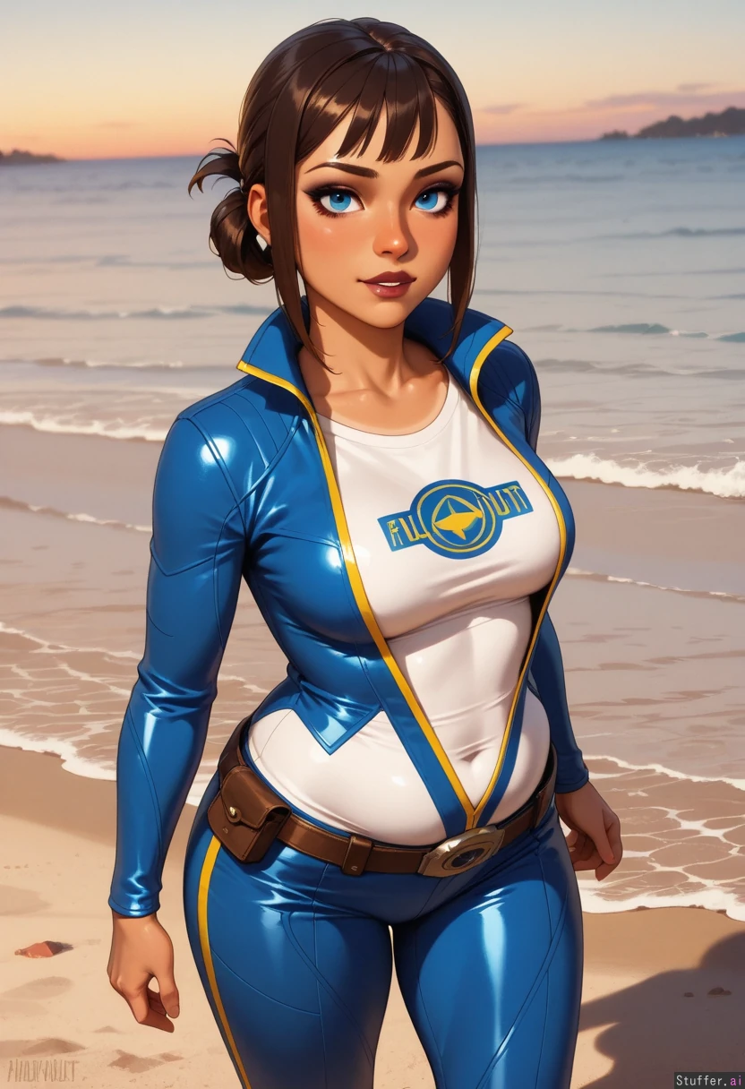 ((Fallout series, Lucy, dark blue vault suit, white t shirt underneath, long dark brown hair, hair tied, round blue eyes, dark makeup, slightly tanned skin, narrow straight nose, square jawline, pronounced upper lip, 1 girl)) Fit, thin, slim, narrow waist, thin body, long legs, Beach, daytime, golden hour, Medium breasts, horny expression, flirting with viewer, has a crush on the viewer, (love handles, chubby, obese, belly rolls: 0.9 )