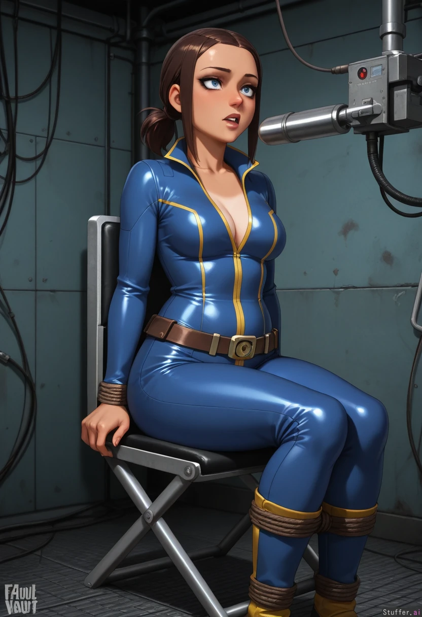 ((Fallout series, Lucy, dark blue vault suit, long dark brown hair, hair tied, round blue eyes, dark makeup, slightly tanned skin, narrow straight nose, square jawline, pronounced upper lip, 1 girl)) Fit, thin, slim, narrow waist, thin body, long legs, Vault, dark, Medium breasts, horny expression, Feeding machine, black tube in mouth, sitting on a metal chair, tied to chair, (love handles, chubby, obese, belly rolls: 0.9 )