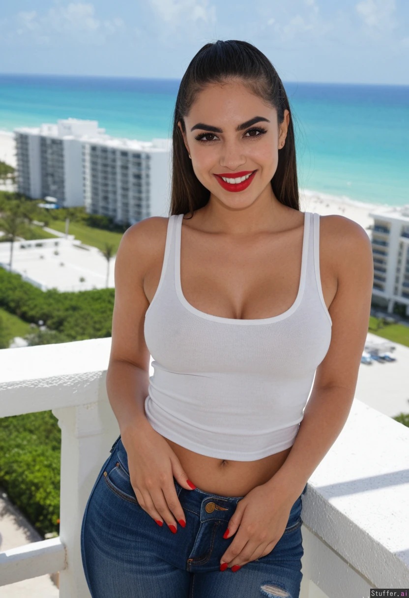 Supermodel, masterpiece, perfect face, thick eyebrows, eyelashes, Mexican, Latina, jeans, tank top , Miami Beach balcony , smile, flirt, red lipstick , sexy