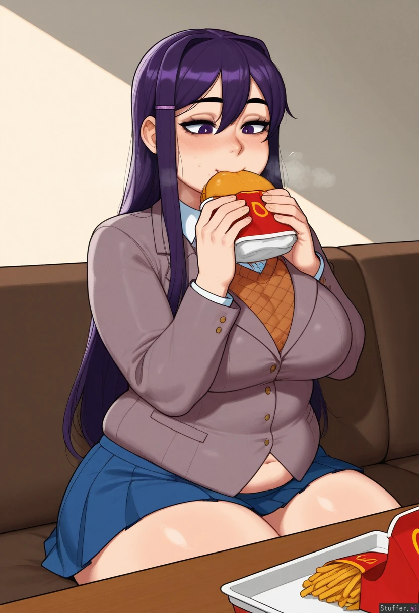 krekkov(artists), KAMII MOMORU(artist), beautiful shading, highly detailed, best quality, perfect anatomy, perfect proportions, perfect lighting, Solo, (Yuri from Doki Doki Literature Club), long purple hair, mascara, uniform, mini skirt, sitting on sofa, lazy, (fast food on the table), afternoon, eating, (plump body: 1.2),