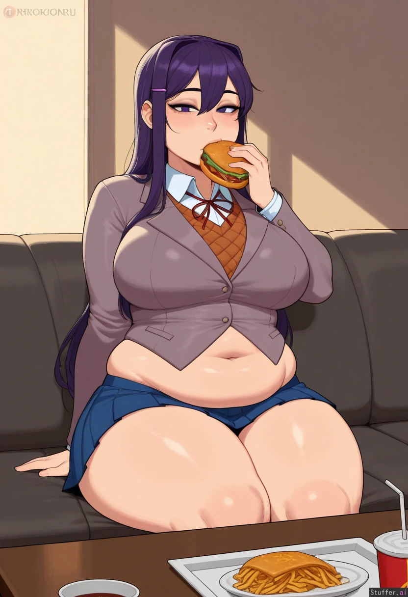 krekkov(artists), KAMII MOMORU(artist), beautiful shading, highly detailed, best quality, perfect anatomy, perfect proportions, perfect lighting, Solo, (Yuri from Doki Doki Literature Club), long purple hair, mascara, uniform, mini skirt, sitting on sofa, lazy, (fast food on the table), afternoon, eating, (plump body: 1.3),