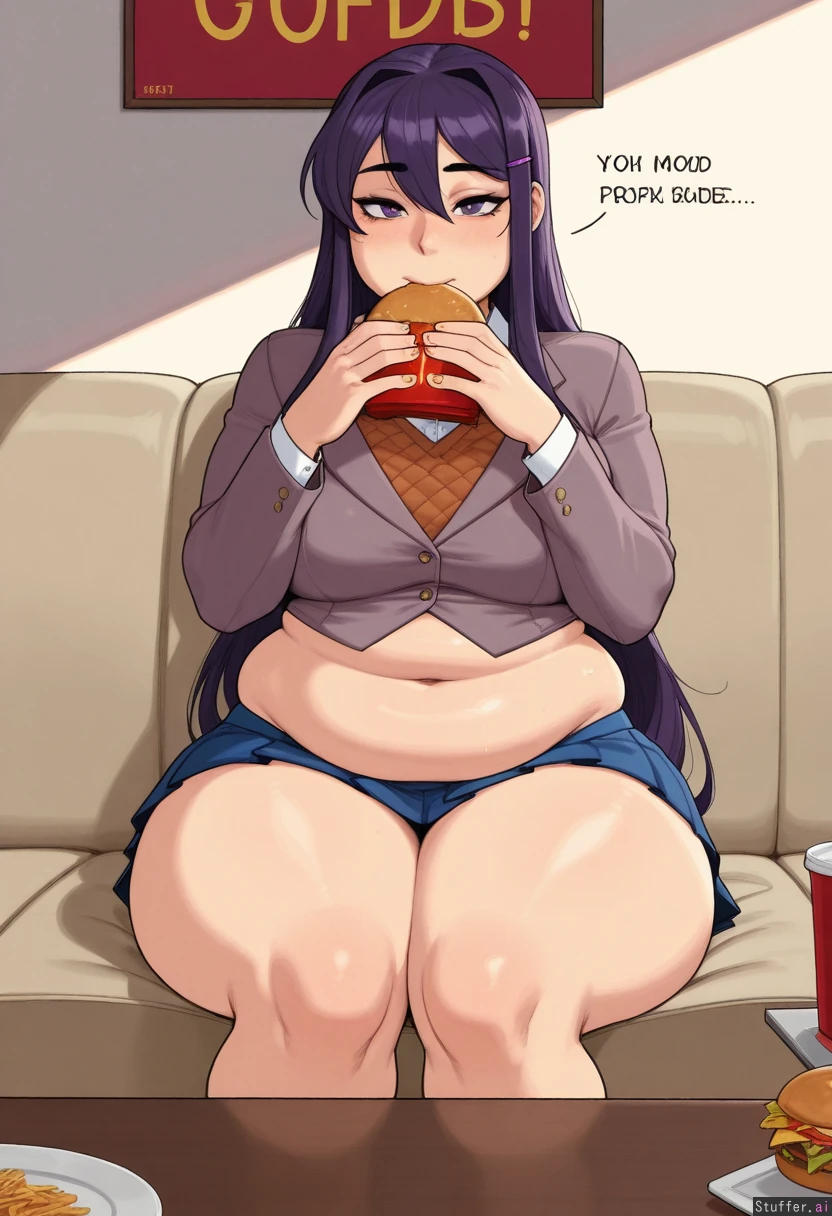 krekkov(artists), KAMII MOMORU(artist), beautiful shading, highly detailed, best quality, perfect anatomy, perfect proportions, perfect lighting, Solo, (Yuri from Doki Doki Literature Club), long purple hair, mascara, uniform, mini skirt, sitting on sofa, lazy, (fast food on the table), afternoon, eating, (plump body: 1.4),