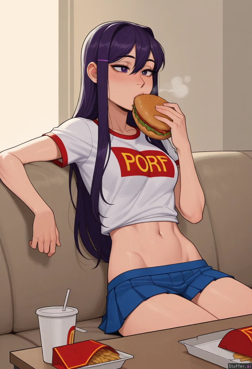 krekkov(artists), KAMII MOMORU(artist), beautiful shading, highly detailed, best quality, perfect anatomy, perfect proportions, perfect lighting, Solo, (Yuri from Doki Doki Literature Club), long purple hair, mascara, uniform, mini skirt, sitting on sofa, lazy, (fast food on the table), afternoon, eating, (skinny body: 1.2),
