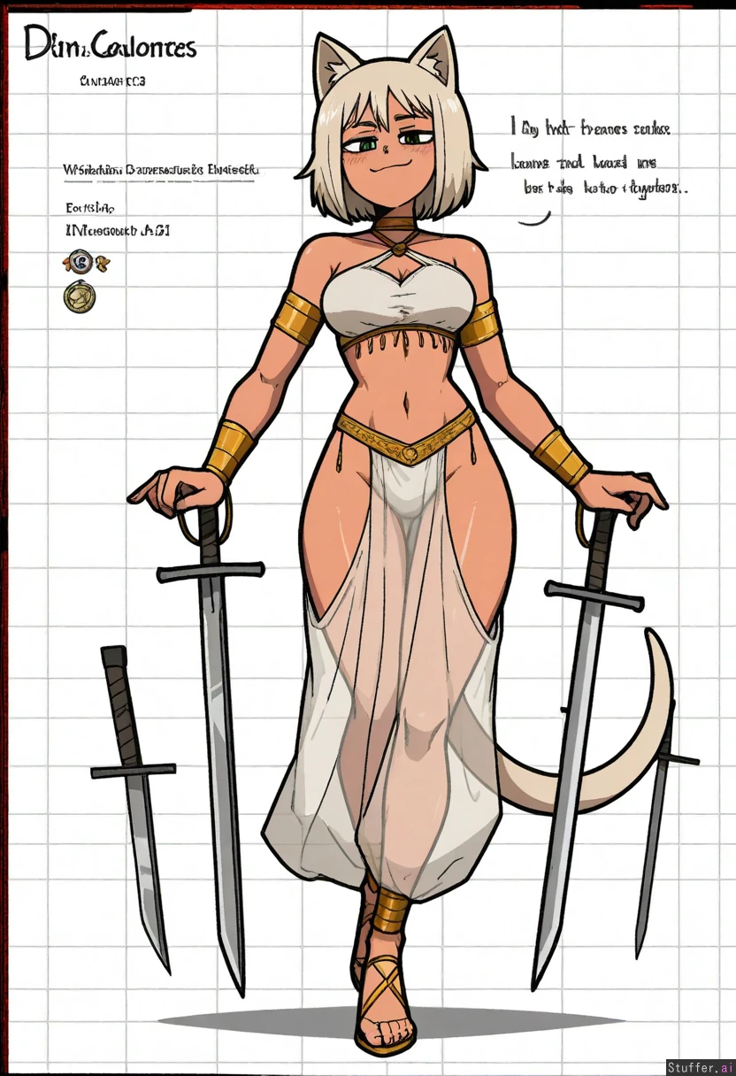 Fantasy, cat girl, dancer, arabic fairy tales, silk clothes, smug, swords, beige hair