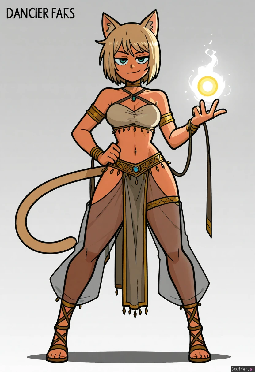 Vanripper, mark gavatino, stopu42 Character concept, simple white background, full body shot, dim colours, solo Fantasy, cat girl, dancer, arabic fairy tales, silk clothes, smug, beige hair, glowing magic orb
