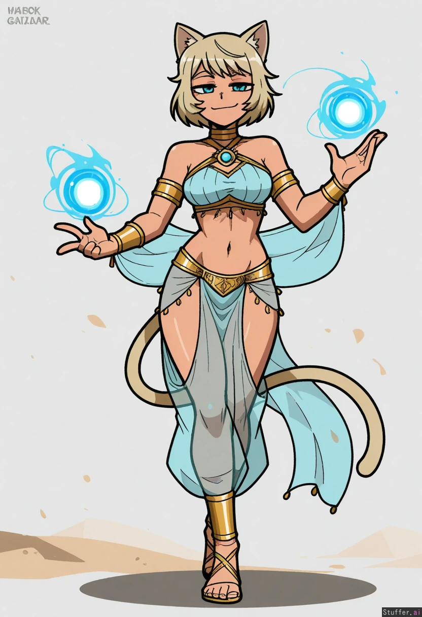 Vanripper, mark gavatino, stopu42 Character concept, simple white background, full body shot, dim colours, solo Fantasy, cat girl, dancer, arabic fairy tales, silk clothes, smug, beige hair, glowing magic orb, (wind and sand magic)