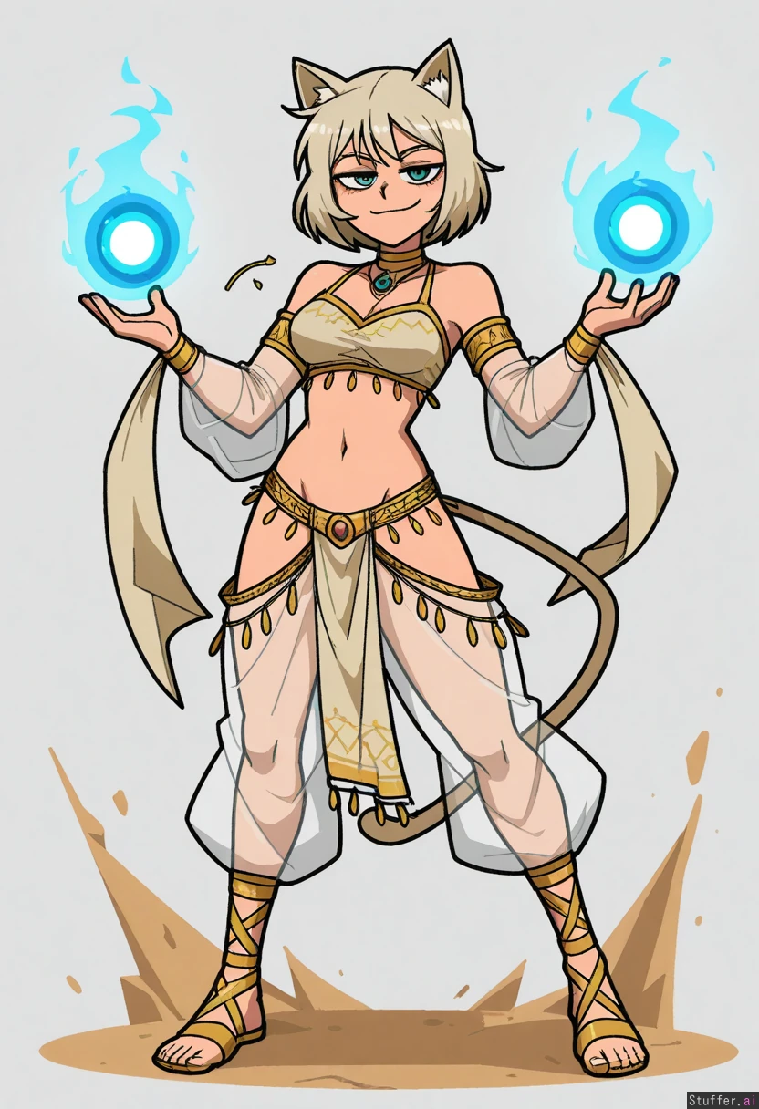 Vanripper, mark gavatino, stopu42 Character concept, simple white background, full body shot, dim colours, solo Fantasy, cat girl, dancer, arabic fairy tales, silk clothes, smug, beige hair, glowing magic orb, (wind and sand magic)