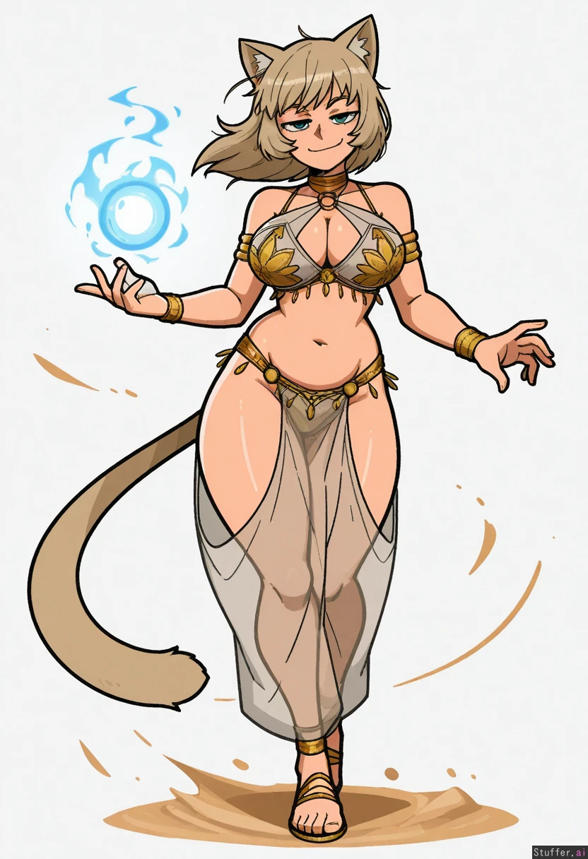 Vanripper, mark gavatino, stopu42 Character concept, simple white background, full body shot, dim colours, solo Fantasy, cat girl, dancer, arabic fairy tales, silk clothes, smug, beige hair, glowing magic orb, (wind and sand magic), chubby, wide hips, large_breasts