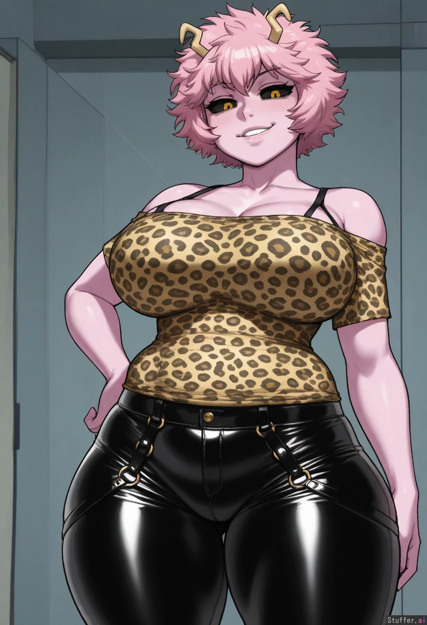 (( solo, krekkov)) (( Mina_ashido (mha), Black sclera, yellow eyes, big_lips, smirk)) (( Black_Leather_pants, long_sleevees, pantyhose, leopard_print_shirt, off-shoulder_shirt, black_straps, bottom_heavy, wide_hips)) (( huge_breasts:0.9)) (( chubby_belly:1.0)) (( thick_thighs:1.2))