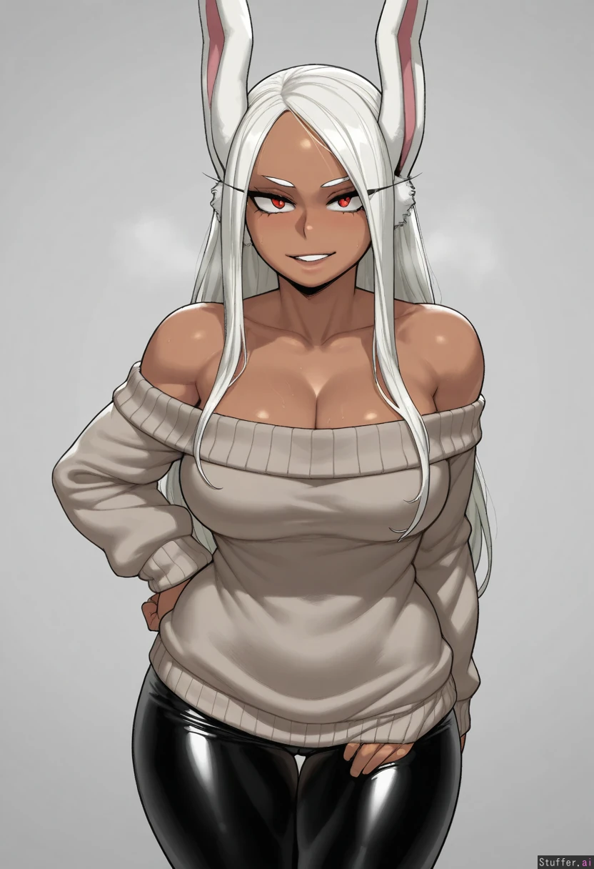 (( solo, krekkov)) (( Mirko (my Hero academia), very_dark_skin )) (( Leather_pants, sweater_shirt, off-shoulder_sweater))