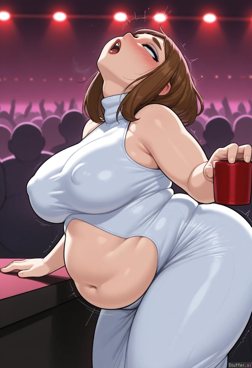 (( solo, krekkov)) (( ochako_uraraka)) (( Tight_dress, white_dress, midriff, sleeveless_turtleneck, long_dress, red_lipstick, blue_eyeshadow, nipple_outline)) (( chubby_belly:1.8)) (( large_breasts:1.0)) (( thick_thighs:1.0)) (( Party, crowd, red_lighting, ((holding_red_cup)), leaning_on_counter, rumbling_stomach, side_view, bent_over closed_eyes, covered_navel, motion_lines, head_back, heavy_blush, nose_blush, drunk, ahegao, looking_down, tired, open_mouth))