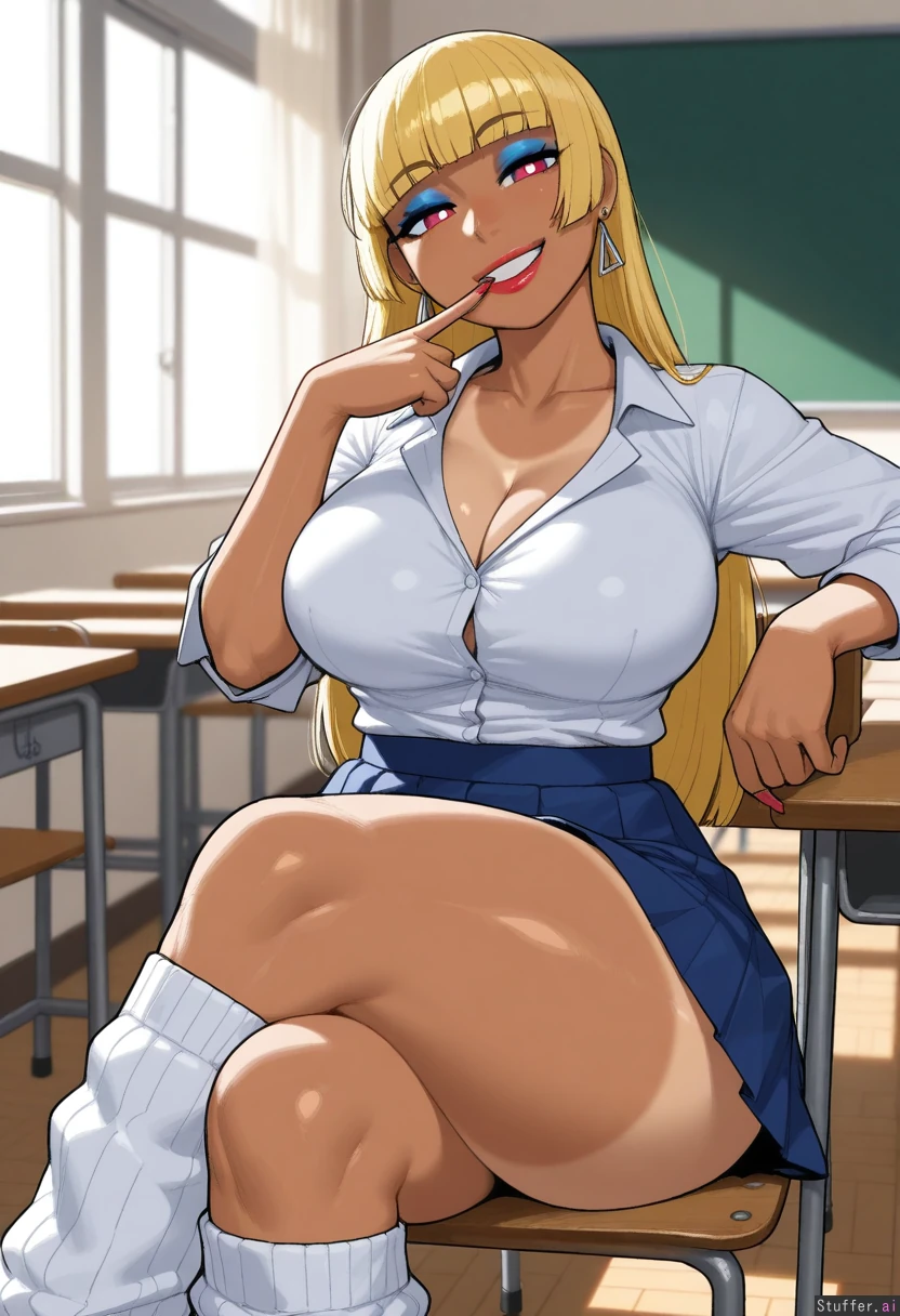 (( solo, krekkov)) (( Big_lips, hime_cut, blonde_hair, pink_eyes, white_pupils, red_lipstick, blue_eyeshadow, silver_earrings, ((tanned_skin)) gyaru )) ((, white_shirt, collared_shirt, blue_skirt, long_skirt, white_leg_warmers)) (( large_breasts:1.0)) (( thick_thighs:1.0)) (( Dawn, sunlight, Classroom, sitting, chair, crossed_legs, finger_in_mouth, smiling, head_tilt))