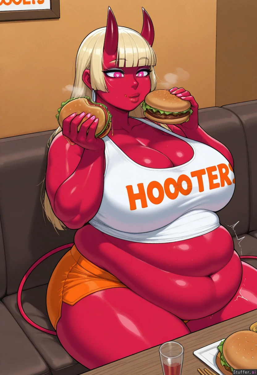 (( 1girl, solo, krekkov)) (( Big_lips, hime_cut, blonde_hair, red_lipstick, pink_eyes, white_pupils blue_eyeshadow, silver_earrings, ((red_skin)) Demon_tail, gyaru, pink_nails, medium_horns, ((red_horns)))) (( Hooters, white_shirt, orange_shorts, thick_arms, cropped_shirt, tight_shirt, cleavage)) (( Medium_breasts:0.9)) (( thick_thighs:0.9)) (( Obese_belly:1.6)) (( ((( orange_lighting, restaurant)), heavy_breathing, ((side_view)), closed_mouth,exposed_belly, glowing_eyes, rumbling_stomach, sitting, wood_couch, wood_table, holding_buger, eating, burger_in_mouth))