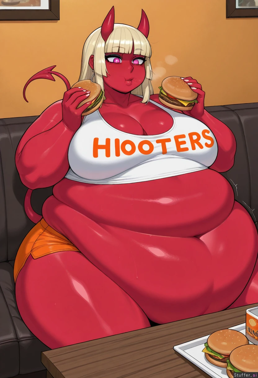 (( 1girl, solo, krekkov)) (( Big_lips, hime_cut, blonde_hair, red_lipstick, pink_eyes, white_pupils blue_eyeshadow, silver_earrings, ((red_skin)) Demon_tail, gyaru, pink_nails, medium_horns, ((red_horns)))) (( Hooters, white_shirt, orange_shorts, thick_arms, cropped_shirt, tight_shirt, cleavage)) (( Medium_breasts:0.9)) (( thick_thighs:0.9)) (( Obese_belly:2.4)) (( ((( orange_lighting, restaurant)), heavy_breathing, ((side_view)), closed_mouth,exposed_belly, glowing_eyes, rumbling_stomach, sitting, wood_couch, wood_table, holding_buger, eating, burger_in_mouth, breasts_apart))