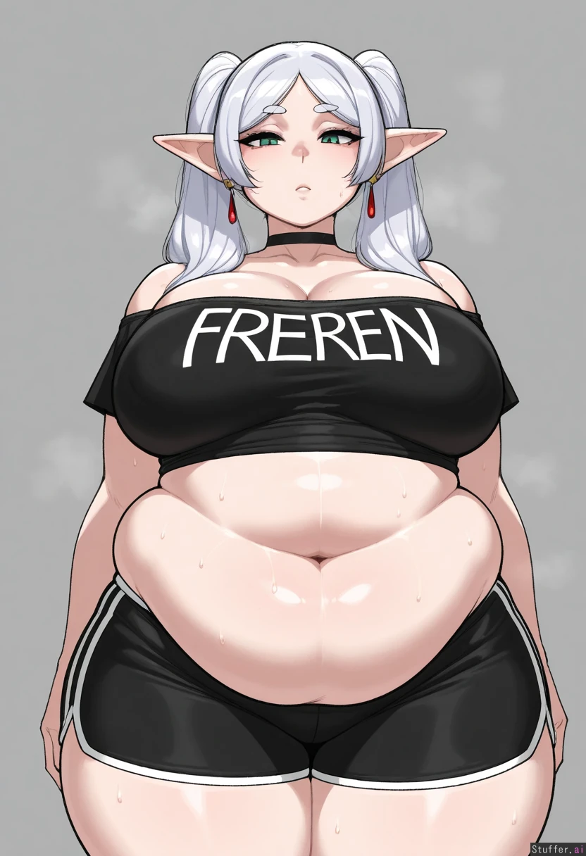 (( 1girl, solo, krekkov)) (( Frieren )) (( Medium_breasts:0.9)) (( thick_thighs:0.9)) (( Obese_belly:1.3)) (( cropped_shirt, black_shirt, off-shoulder_shirt))