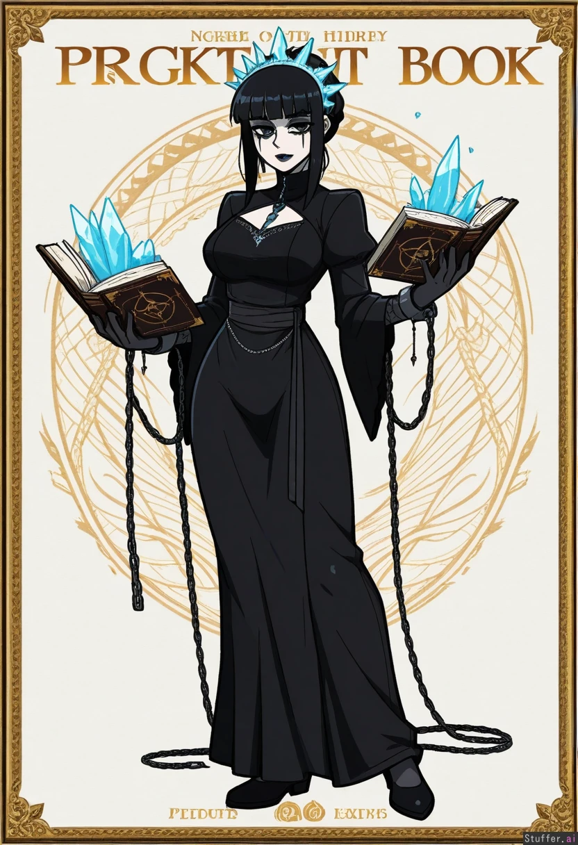 Vanripper, mark gavatino, stopu42 Character concept, simple white background, full body shot, dim colours, solo Fantasy, goth makeup, elegant black dress, long black hair, sidelocks, frost mage, adult woman, beautiful facial features, proud, dark lipstick, ice headdress, ice jewelry, pale skin, teardrop_facial_mark, (chained to her book:1.2), grimoire, ice magic