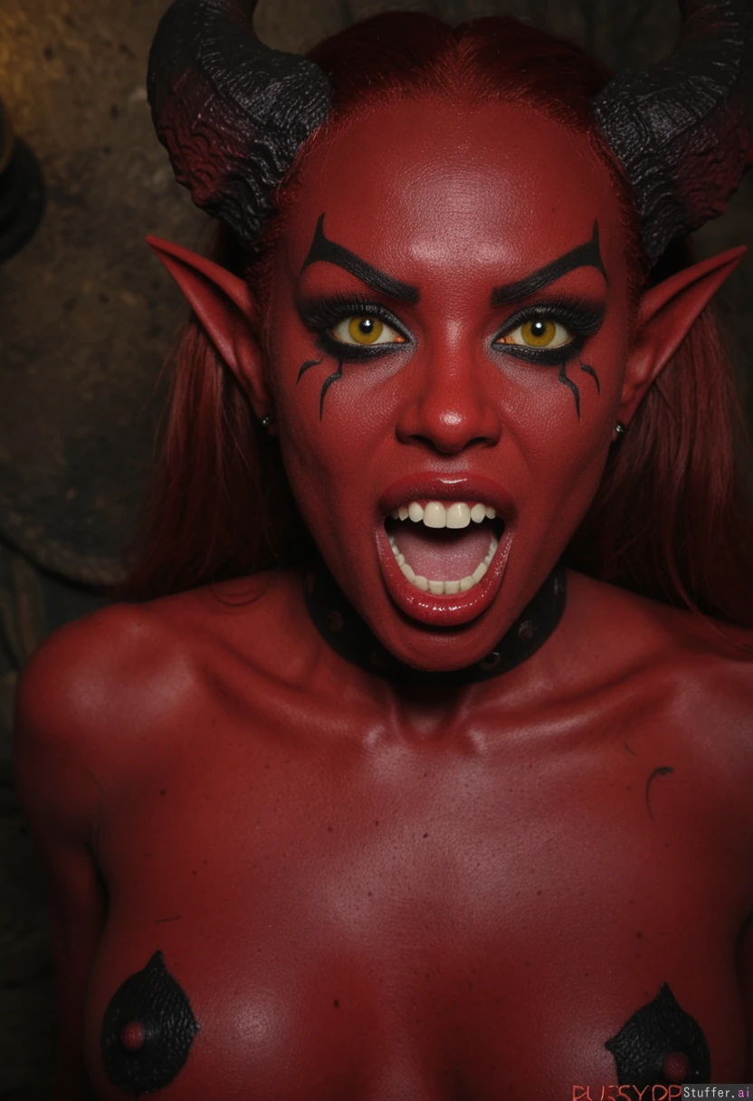 (( 1girl, solo, bushyspicy (artist) )) (( demon_girl, red_skin, big_lips, fangs_out, yellow_eyes))